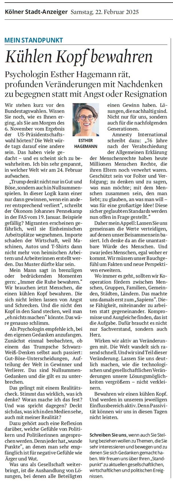 Als Psychologin rate ich, profunden Veränderungen mit Nachdenken zu begegnen statt mit Angst oder Resignation. Hier ist der Standpunkt, der am Samstag, den 22. Februar 2025 im Kölner Stadtanzeiger veröffentlicht wurde.